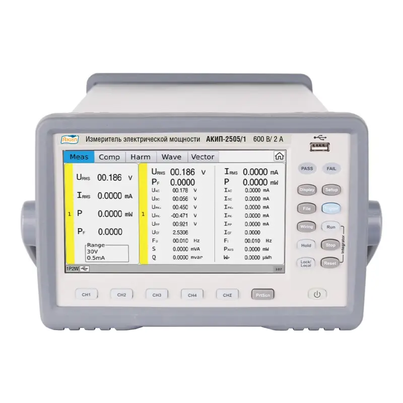 Измеритель мощности АКИП-2505/1 представляет собой высокотехнологичное устройство, предназначенное для точного измерения электрических параметров в различных системах. Этот прибор способен работать с четырьмя каналами одновременно, что делает его особенно удобным для анализа многоканальных систем. С его помощью можно производить измерения как в однофазных, так и в трехфазных сетях, что открывает широкие возможности для профессионалов в области электроэнергетики и автоматизации.