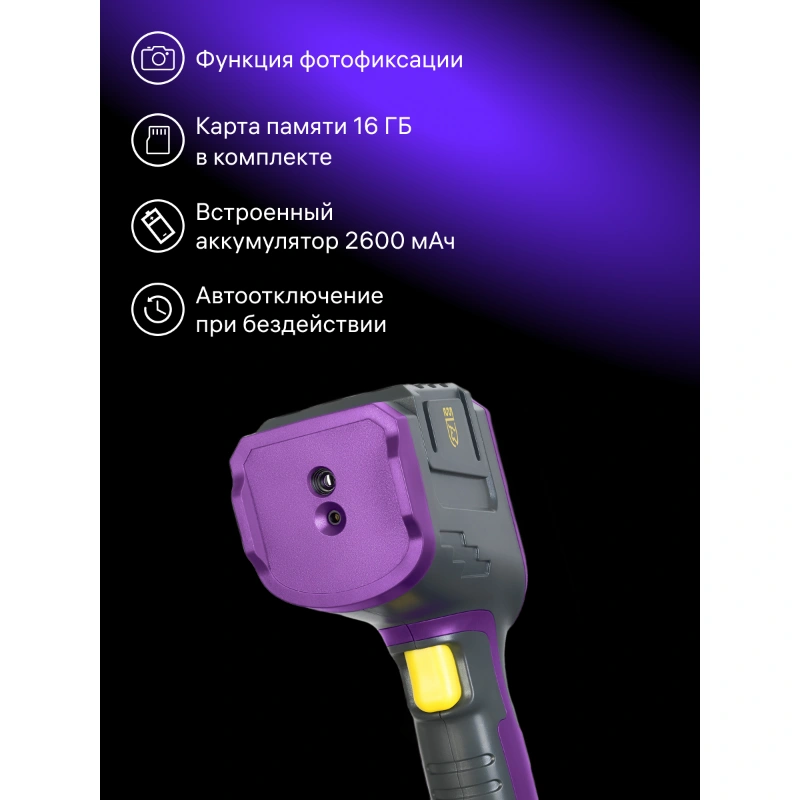 Частота кадров 9 Гц подходит для осмотров, а время отклика 150 мс позволяет быстро увидеть, как меняется температура. Угол обзора 33° удобен для осмотра стен и потолков.